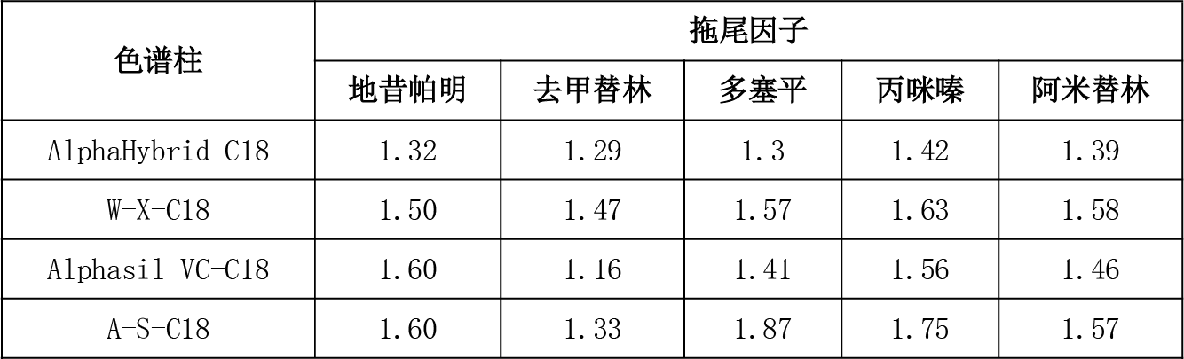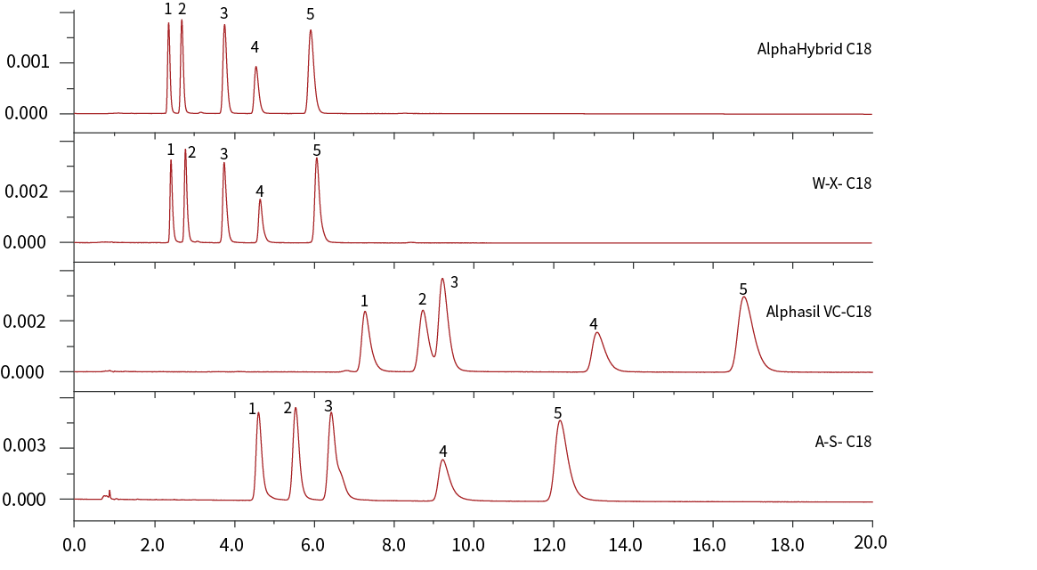 雜化硅膠色譜柱在合成過程中減少了硅醇基的數量,從而降低了其酸性,減少了與堿性化合物的離子交換作用,從5種堿性化合物的分析結果分析,AlphaHybrid C18改善了堿性化合物的峰形和分離效果。