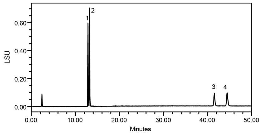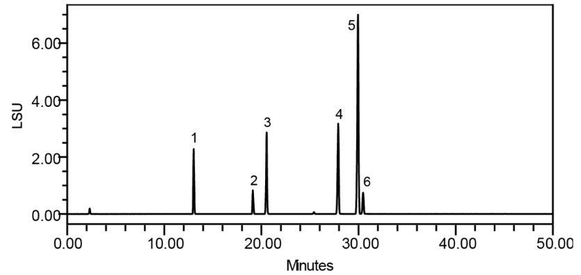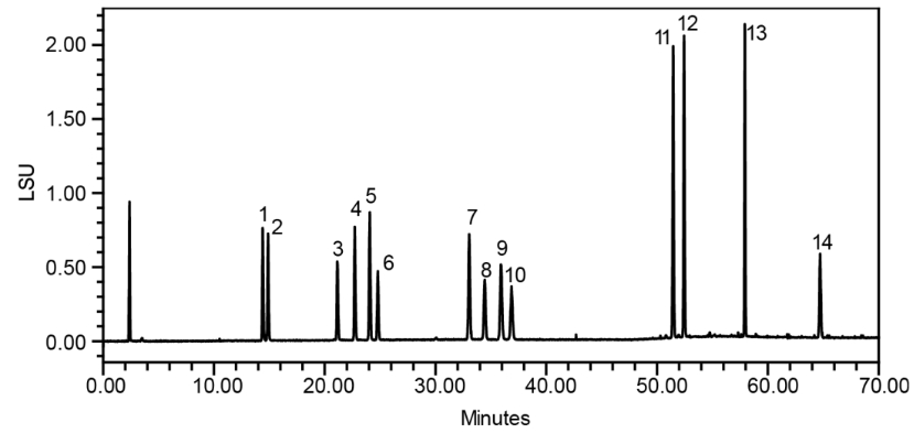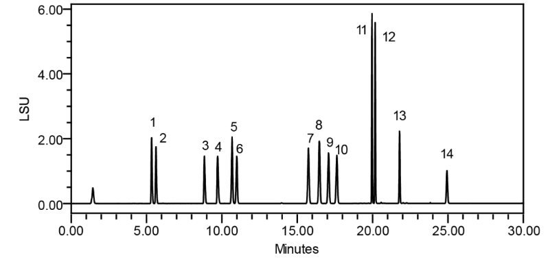 Alphasil ACCHROM Xaqua C18牛黃專用柱不僅可以達(dá)到公示稿中含量測(cè)定要求,通過優(yōu)化標(biāo)準(zhǔn)方法,也可以用于藥材的鑒別,能夠同時(shí)分離14種膽酸類化合物,并展現(xiàn)出良好的分離選擇性、理想的峰形和分離度。