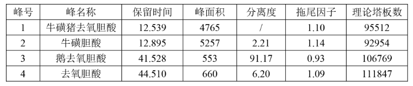 · 牛磺膽酸與牛磺豬去氧膽酸的分離度大于2.0,符合要求;