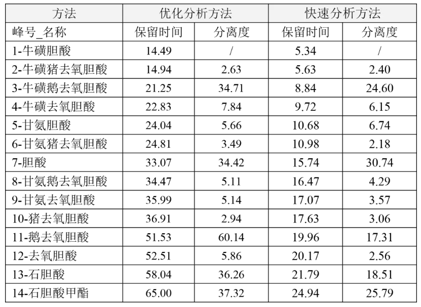 當(dāng)更關(guān)注分析效率時(shí),3.5μm的Alphasil ACCHROM Xaqua C18牛黃專用柱可將14種膽酸類化合物的分析時(shí)間縮短60%,同時(shí)能保證各組分之間的分離度,大大提高了樣品的分析通量。